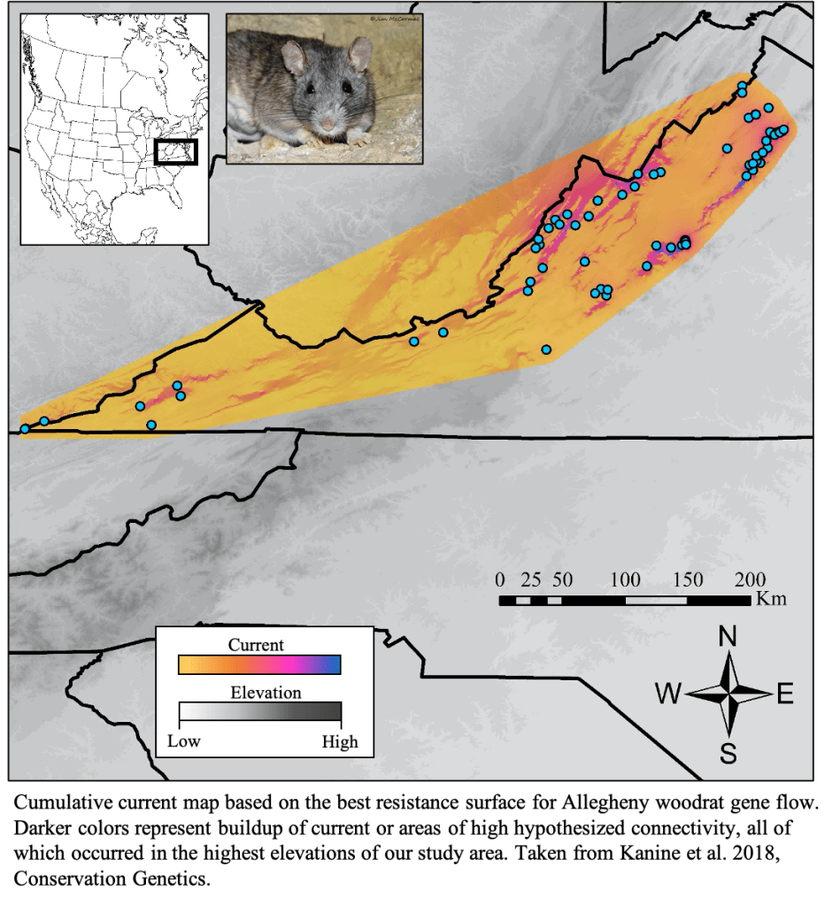 Losses in connectivity and genetic diversity are major concerns for imperiled species. Both connectivity and genetic diversity are considered essential for healthy populations, so my work uses genetic data to evaluate potential threats to conservation concern species. I previously focused on identifying landscape factors that impact connectivity, but more recently, my conservation work involves estimating population densities, inbreeding, and parentage in endangered species like mountain gorillas and black rhinoceros. More locally, I often collaborate with management agencies to assess conservation status of conservation concern species like Allegheny woodrats and Buxton woods white-footed mice.
